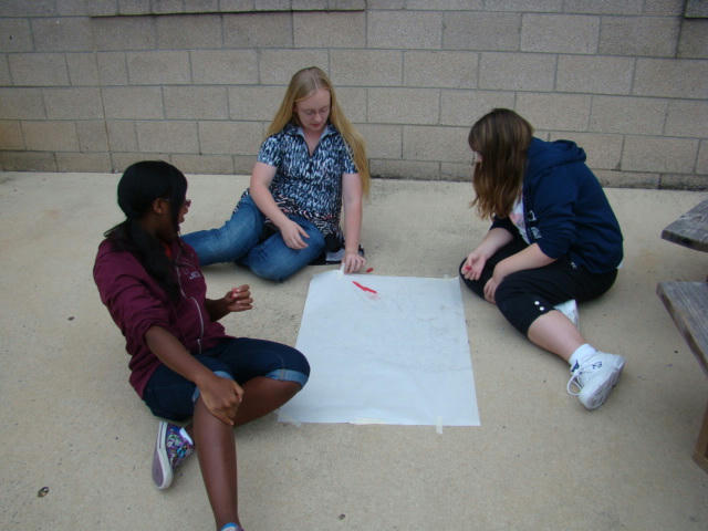 This week we did a mud painting, sound like fun huh? We all choose a picture that a famous artist did and had to enlarge it. Our group did a buuny (a.k.a. muddy) After we enlarged it and trace it on to a bigger piece of paper we had to poke hole in it, not fun! Then the next day we had to trace it on to the sidewalk. Above is a picture of us doing just that.
